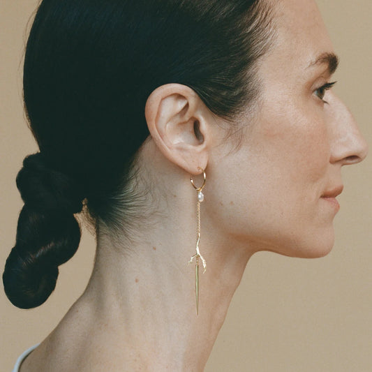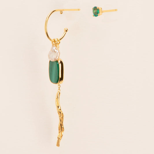 Asymmetric earring with branch-shaped pendant, malachite, pearl and emerald in 18 ct. gold