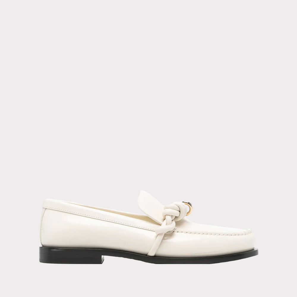 Deze Jil Sander loafers met knoopdetail in een kalkwitte kleur, zijn een moderne interpretatie van tijdloze loafers. Het kalfsleer bovenwerk heeft een subtiel geknoopt detail dat het design een rustige, strakke focus geeft, terwijl het gladde spazzolato-leer en de afgeronde neus zorgen voor een ingetogen elegantie. De leren voering en zool onderstrepen de hoogwaardige afwerking. Een tijdloze loafer die elke look elegant afrondt.